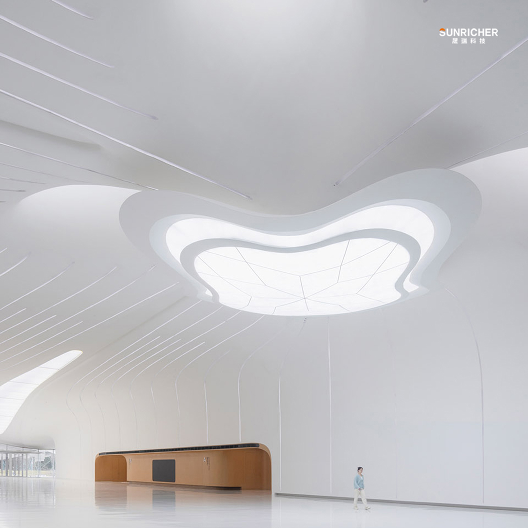 室內大廳中,創造性地融入了綿延的燈帶,它們沿著建筑結構的線條悠然舞動,與巨型ETEF膜材天窗,共同構筑了一個既充滿科技感又極具觀賞價值的空間裝置藝術品。