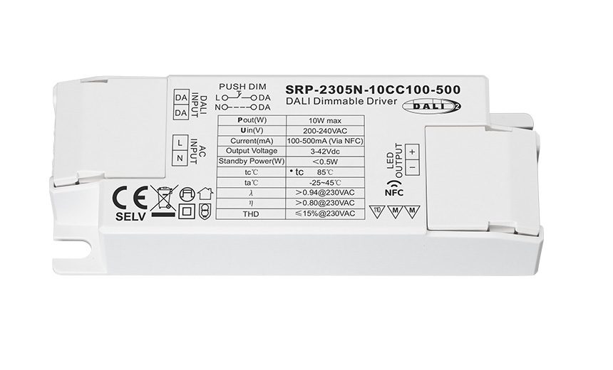 | DALI | 1通道 | 3-42V | 100-500mA via NFC setting; 最低設(shè)置電流檔位間隔低至 0.1mA | 200-240VAC/ 176-280VDC | 最大10W | >0.94 | 101*36*25mm(長*寬*高) |