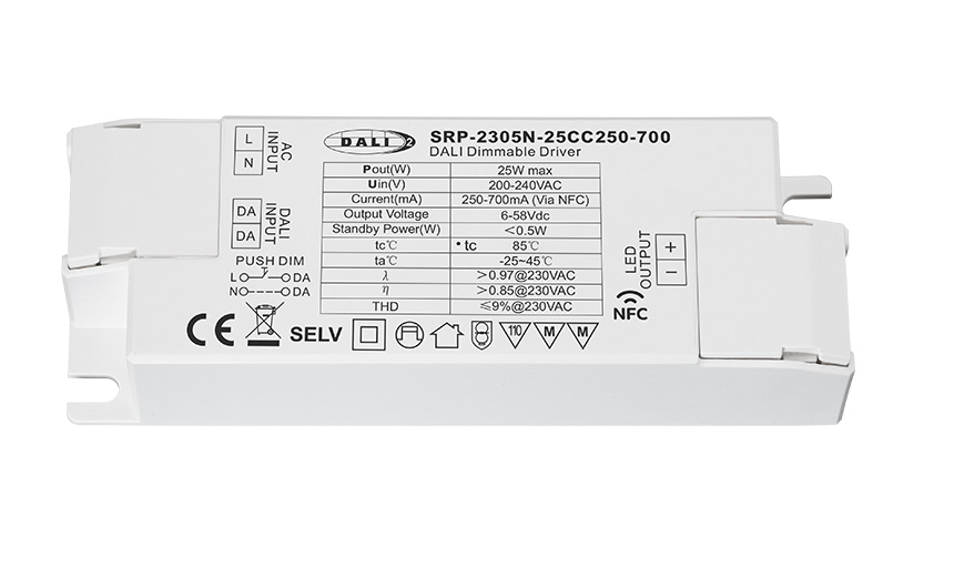 | DALI | 1通道 | 6-54V | 250-700mA via NFC setting; 最低設置電流檔位間隔低至 0.1mA,電流精度低至1% | 200-240VAC/ 176-280VDC | 最大25W | >0.97 | 120*41*28mm(長*寬*高) |