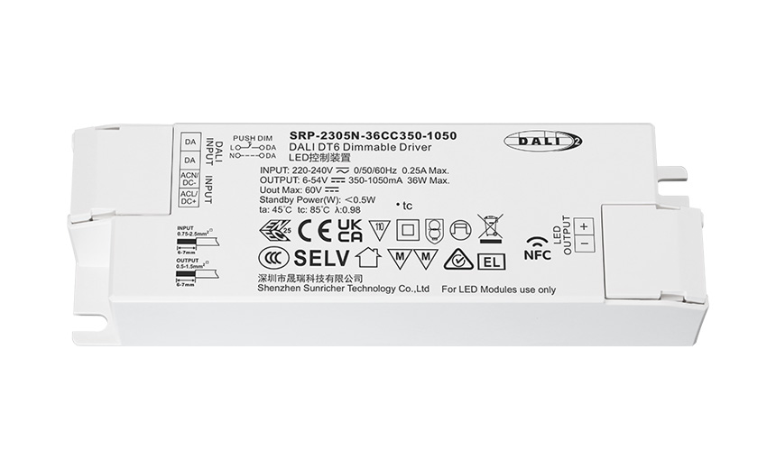 | DALI | 1通道 | 6-54V | 350-1050mA via NFC setting; 最低設置電流檔位間隔低至 0.1mA | 200-240VAC/ 176-280VDC | 最大36W | >0.95 | 145*45*28mm(長*寬*高) |