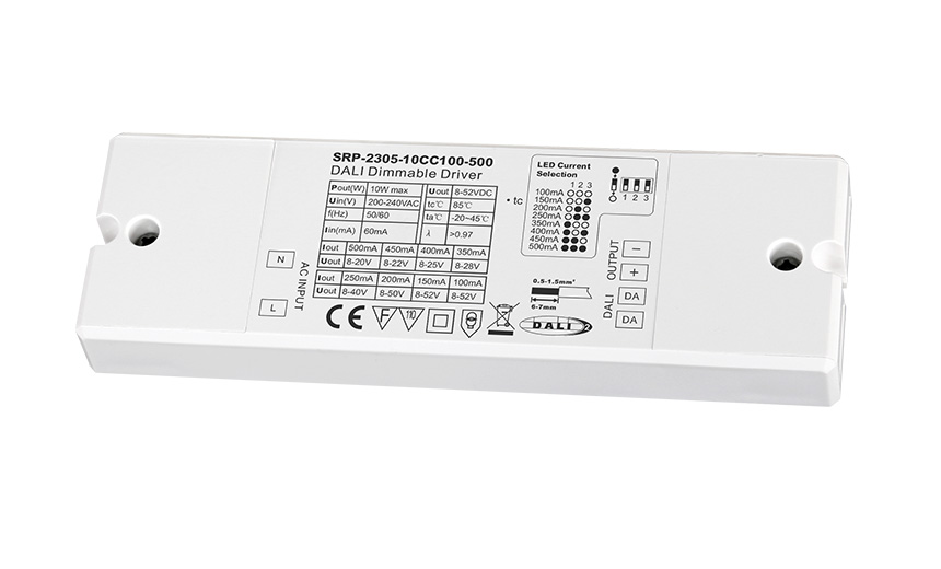 | DALI | 1通道 | 8-52V | 100mA-500mA撥碼選擇,每50mA一檔 | 200-240V | 10W | >0.97 | 145*46.5*16mm(長*寬*高) |